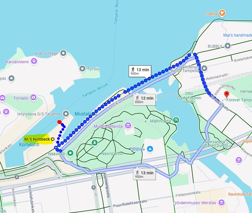 Parkkitalot on hyvä vaihtoehto. Pellavan parkista (kohtuuhintainen) on reilu kilometrin kävely (20 min) maisemasiltaa pitkin Mustalahteen. P-Koskenparkki on vieläkin lähenpänä.